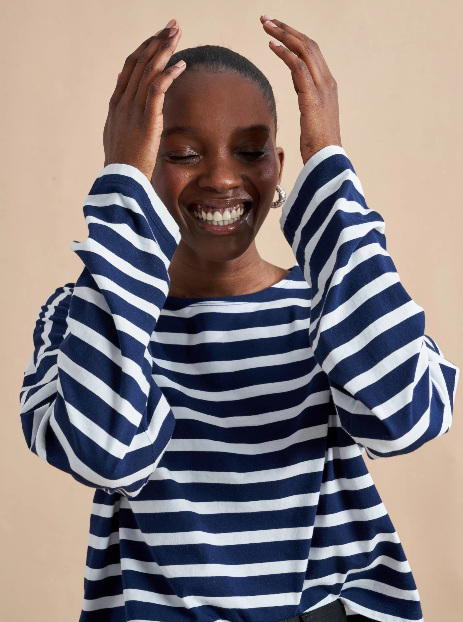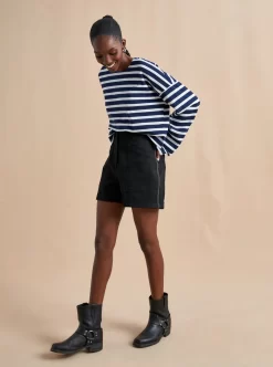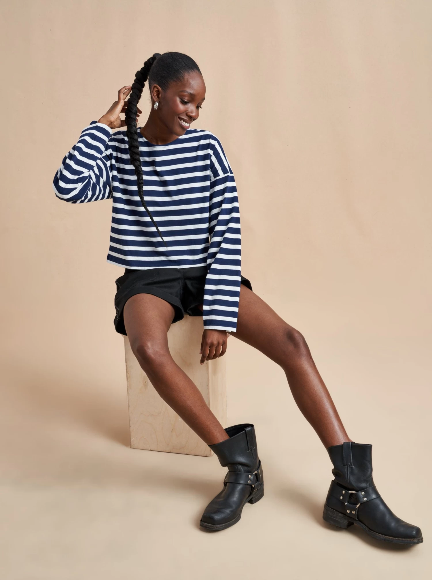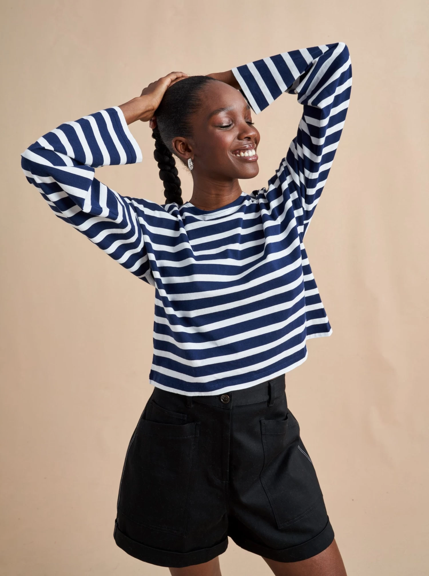 Our new take on the Breton tee, inspired by the one and only, Charlotte Gainsbourg. Cut from our signature lean lines delicious cotton, with a roomier fit, cropped body and classic drop shoulder.