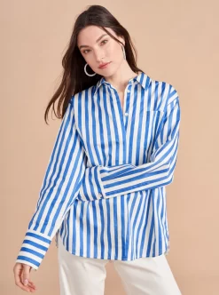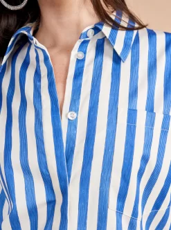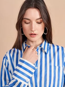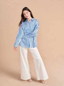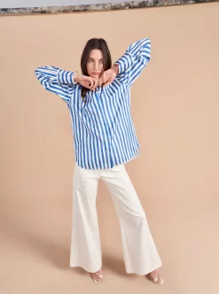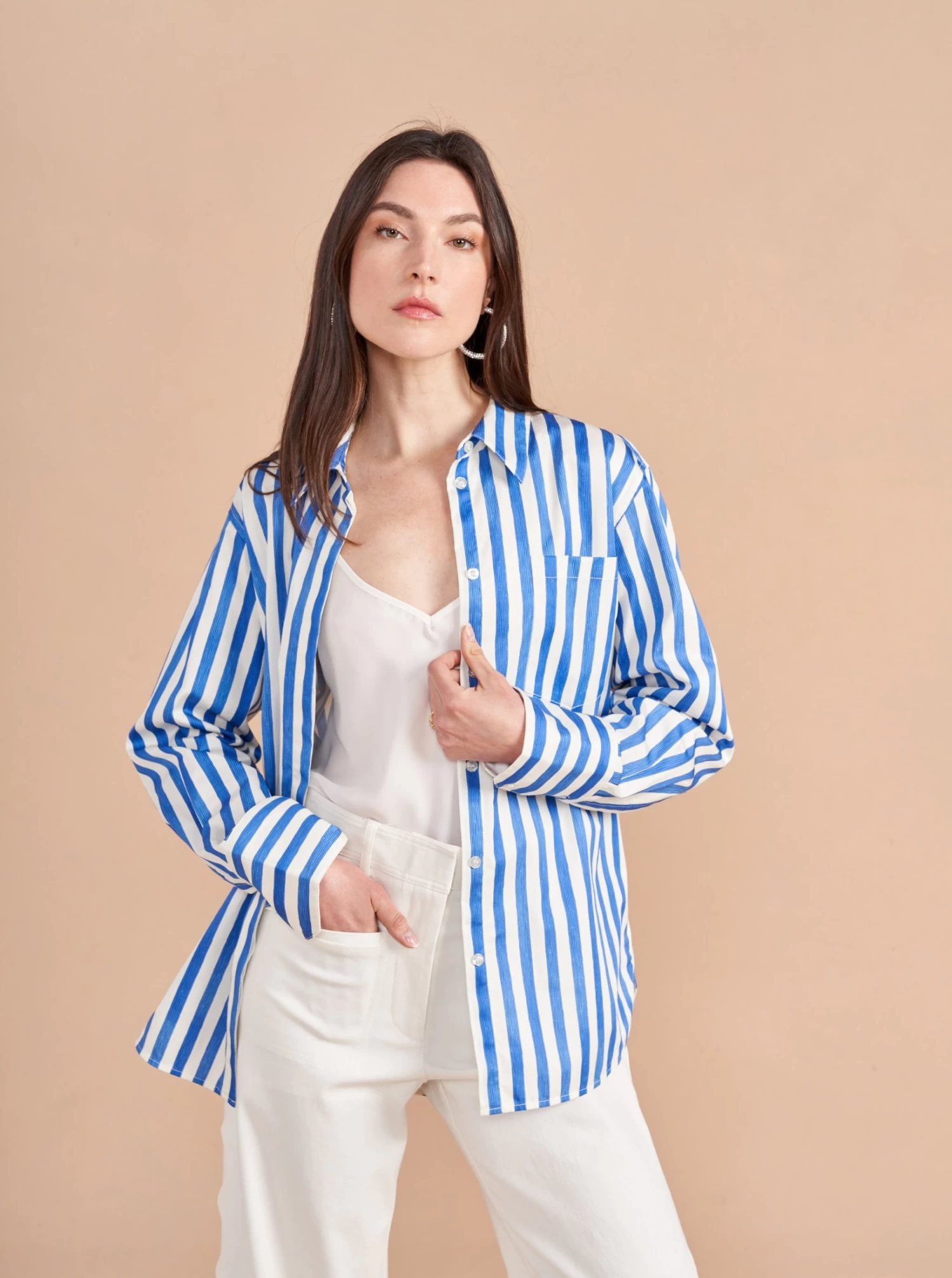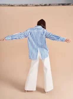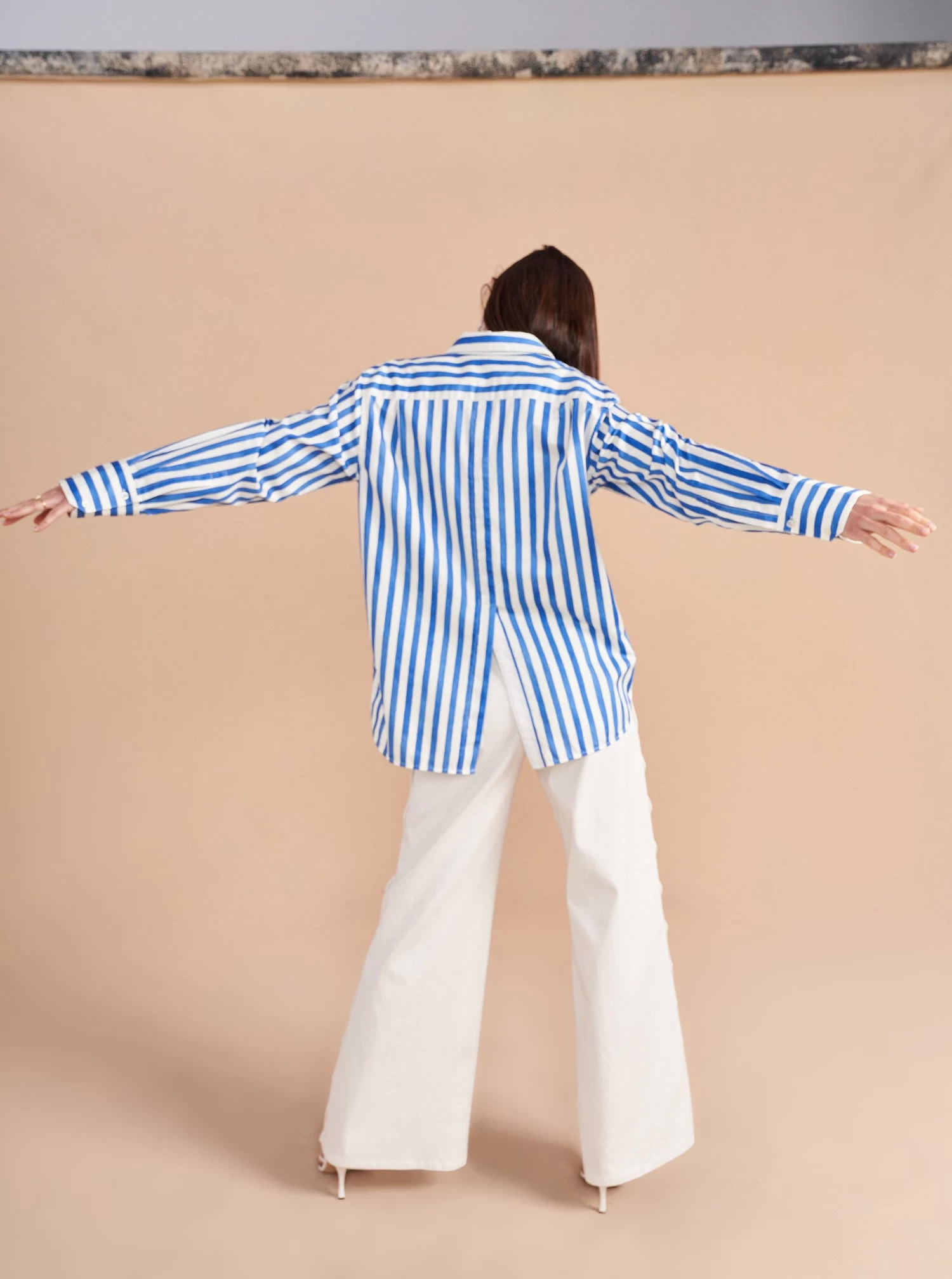 Who doesn’t love a “borrowed from the boys moment”? The next one has arrived with our oversized Jackie button down shirt with exaggerated cuffs in a hand drawn stripe print. And no more fretting about what to wear it with as we have plenty of denim to go with it.