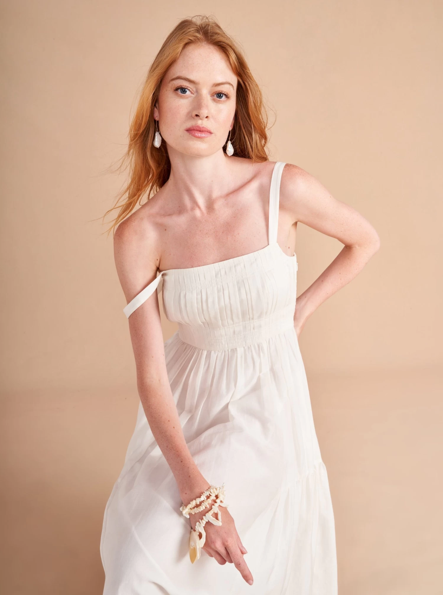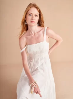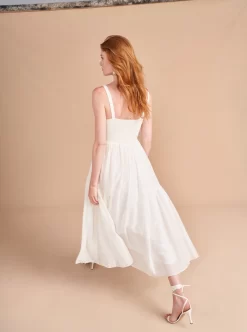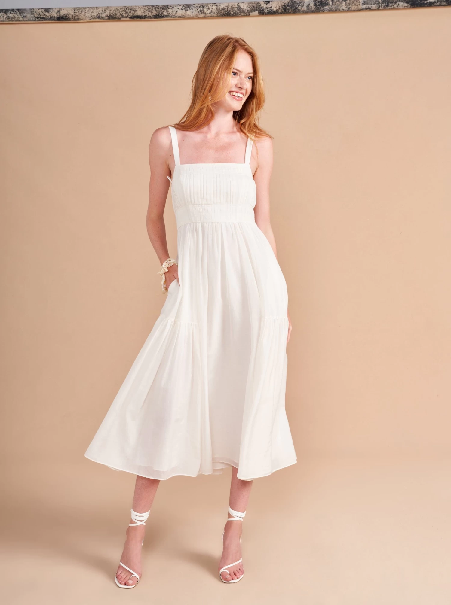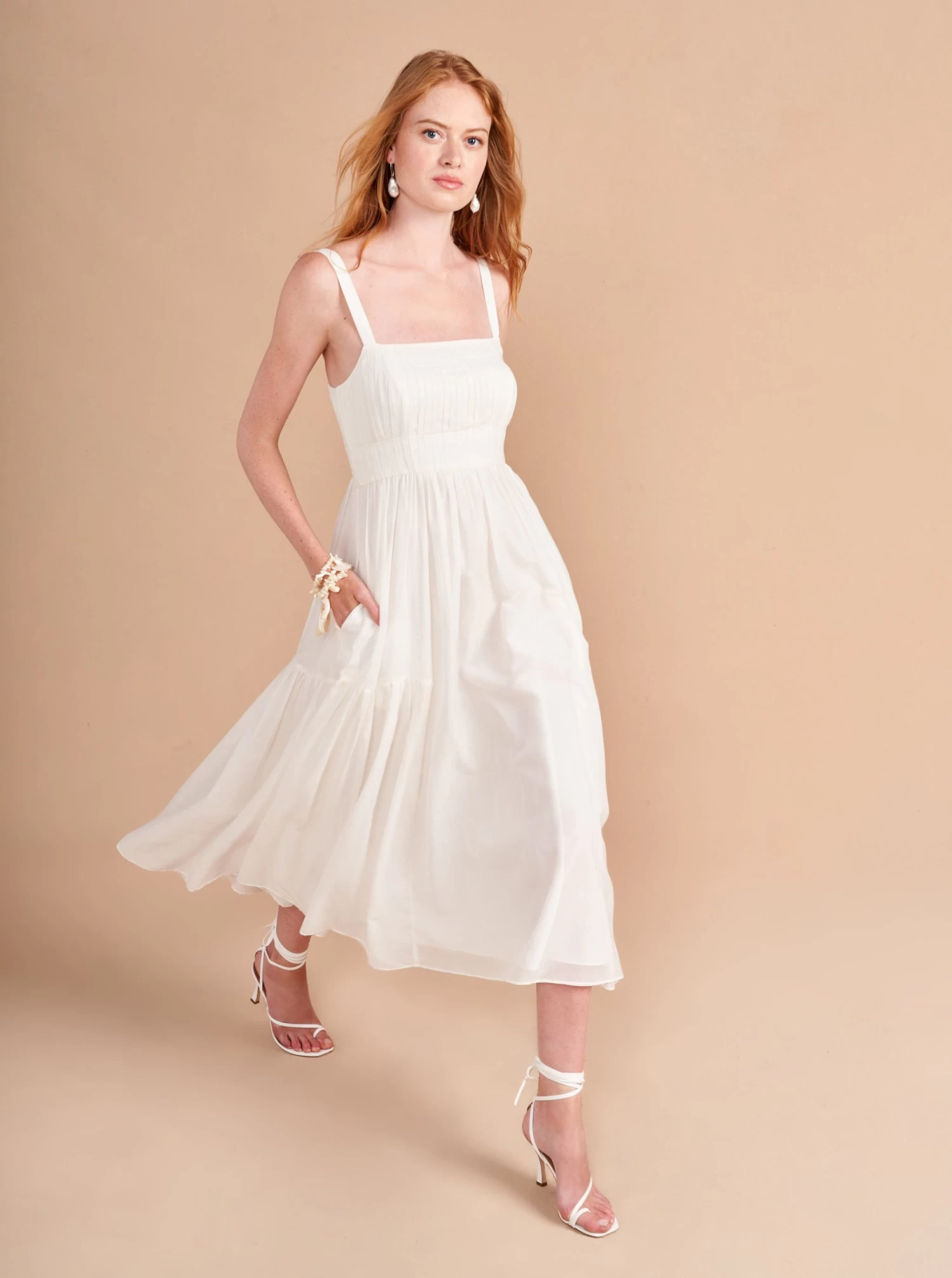 Easy doesn’t always have to mean simple and this dress gives you a ton of punch with thoughtful design details in a flattering fit and flare silhouette, like a ruched bodice with multi needle topstitching, shirring at theย waist, smocking at the back and those essential pockets for easy-does-it, slow strolls along (enter fantasy backdrop here).