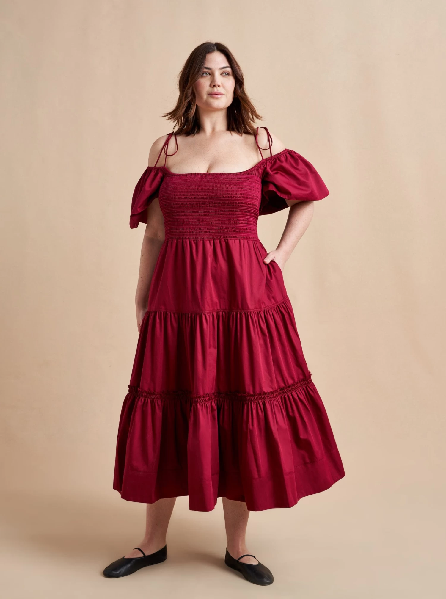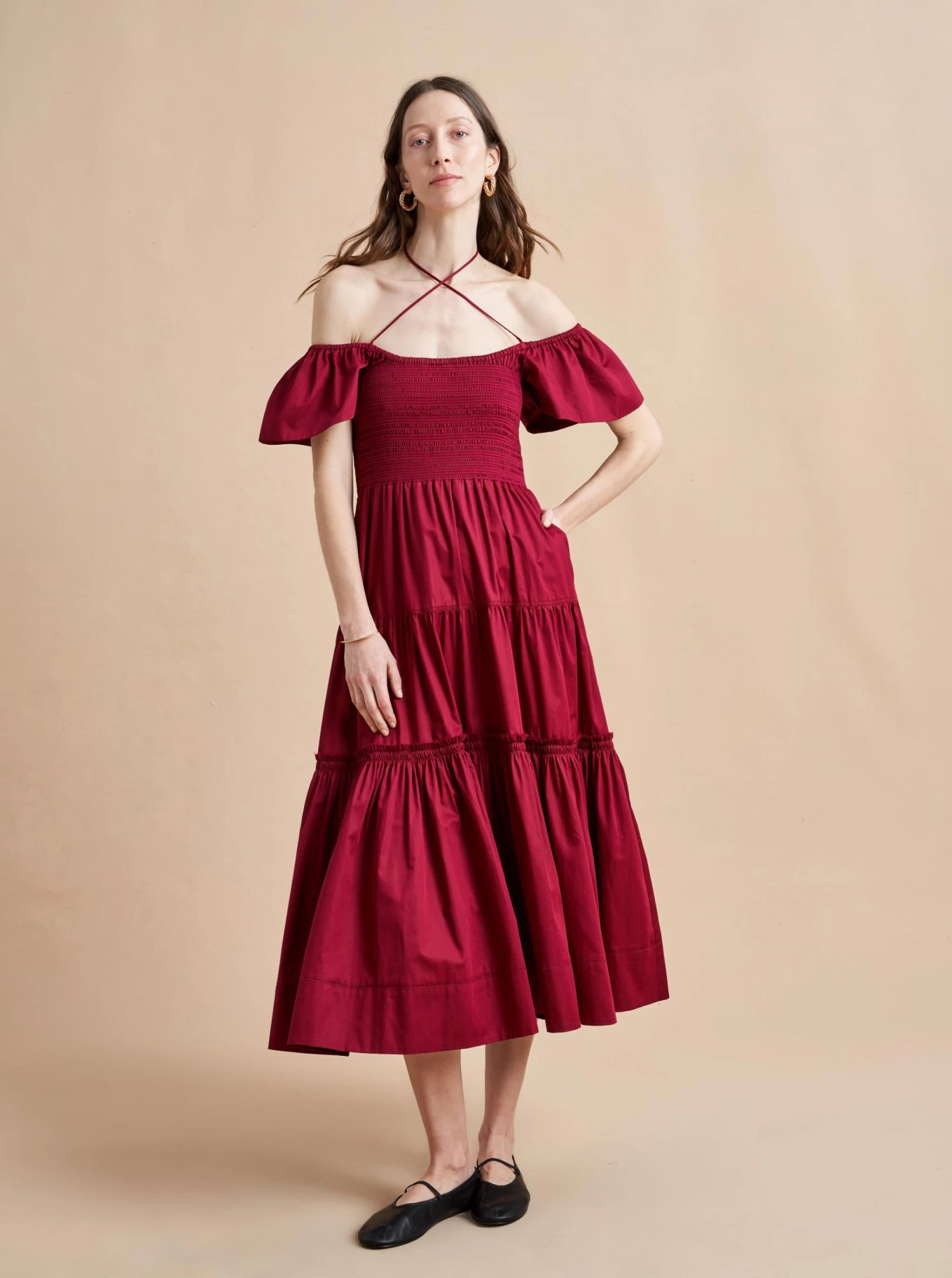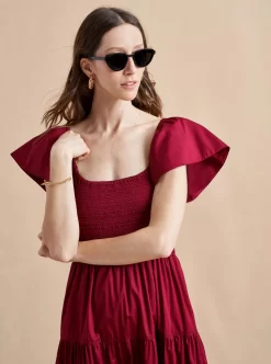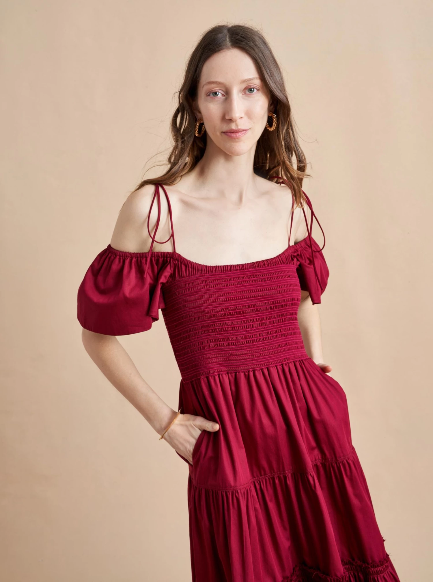 The ideal transitional dress in light cotton, to be worn on or off-the-shoulder with spaghetti straps and smocked bodice. The epitome of day-to-night, wear it with flats for day or pair with heels for an easy, breezy evening look.