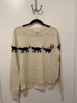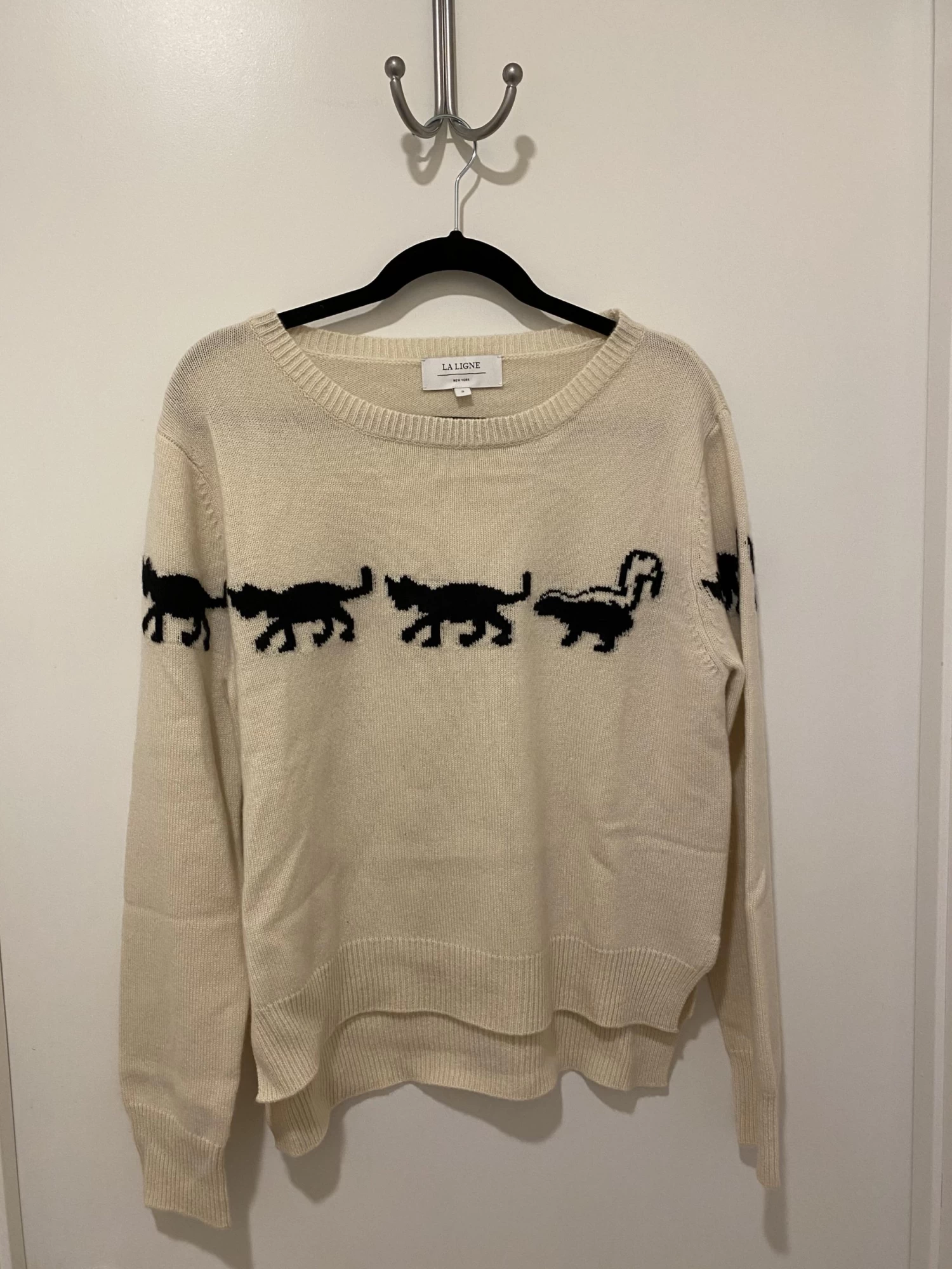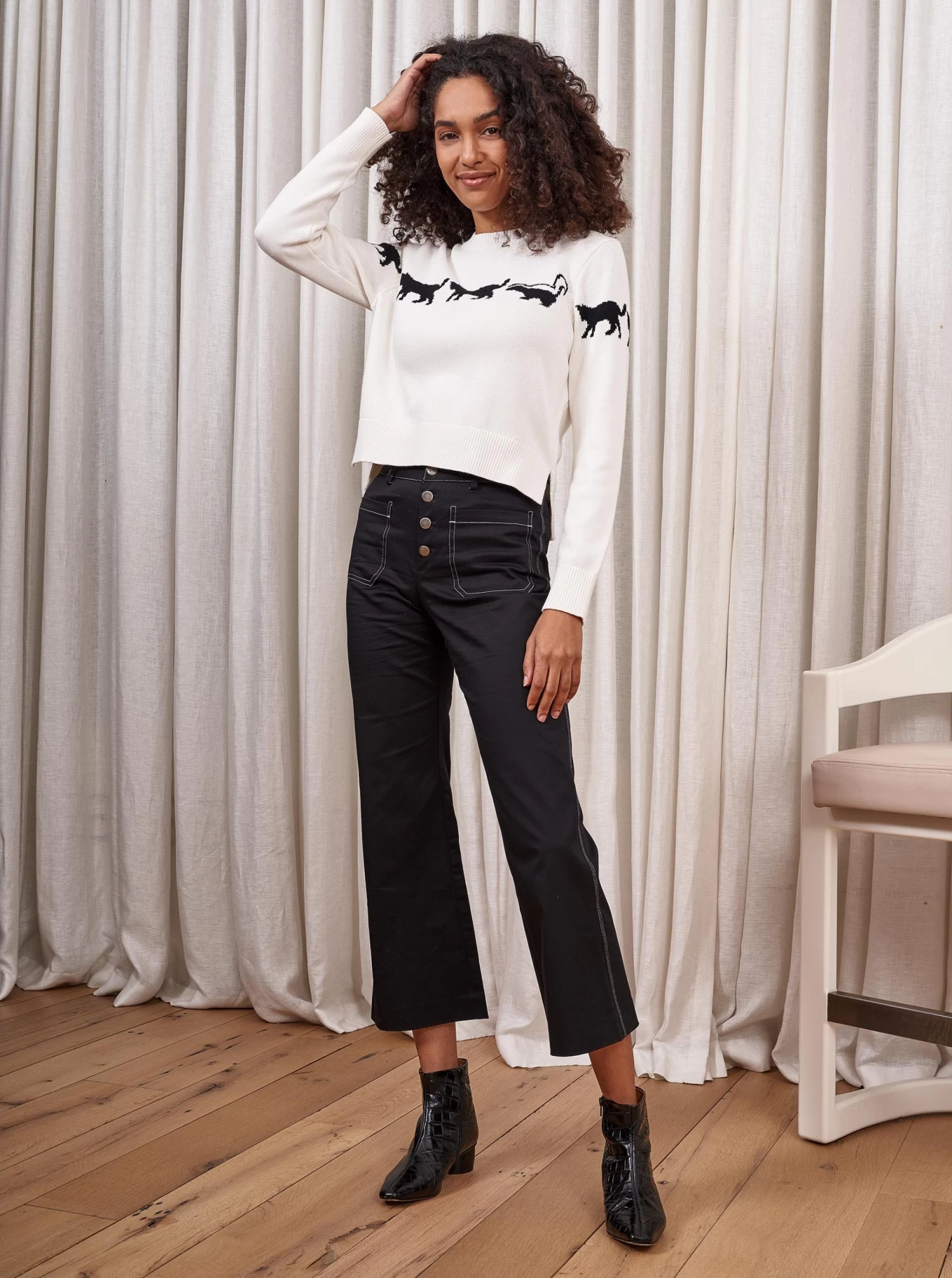 Never be boring in our Pepe Sweater. You will always be the standout in the room when you show your stripes in our shrunken cotton sweater featuring a singular and charismatic skunk in all its striped glory. Because why be like everyone else when you can be your own magnetic, magic self?