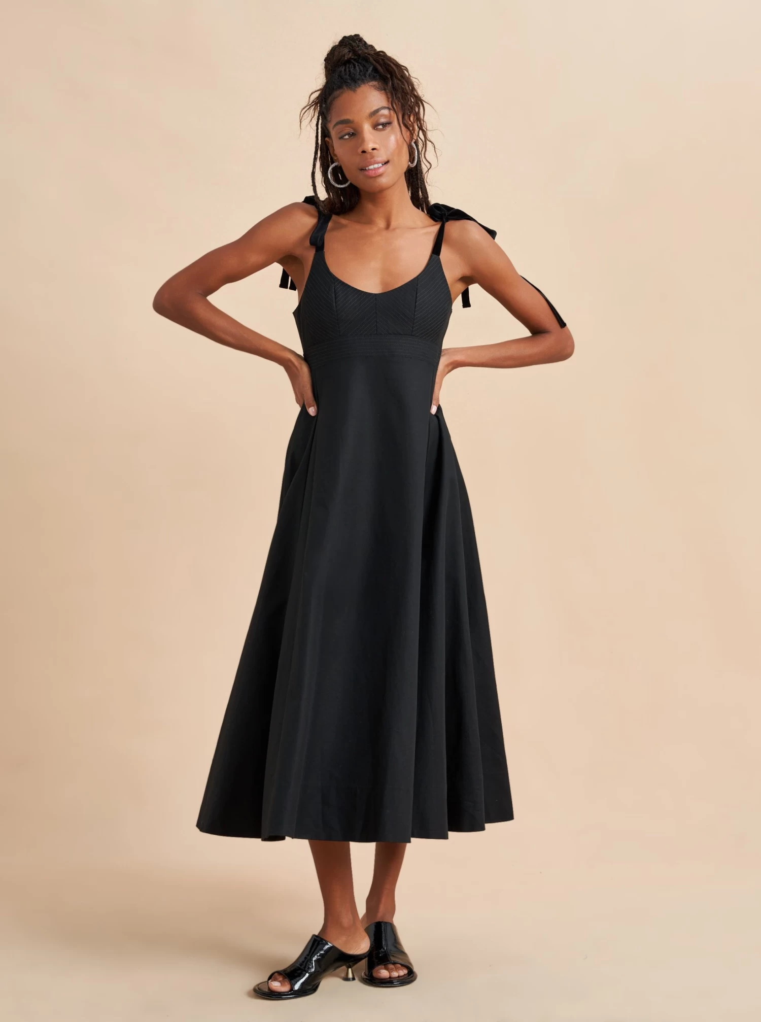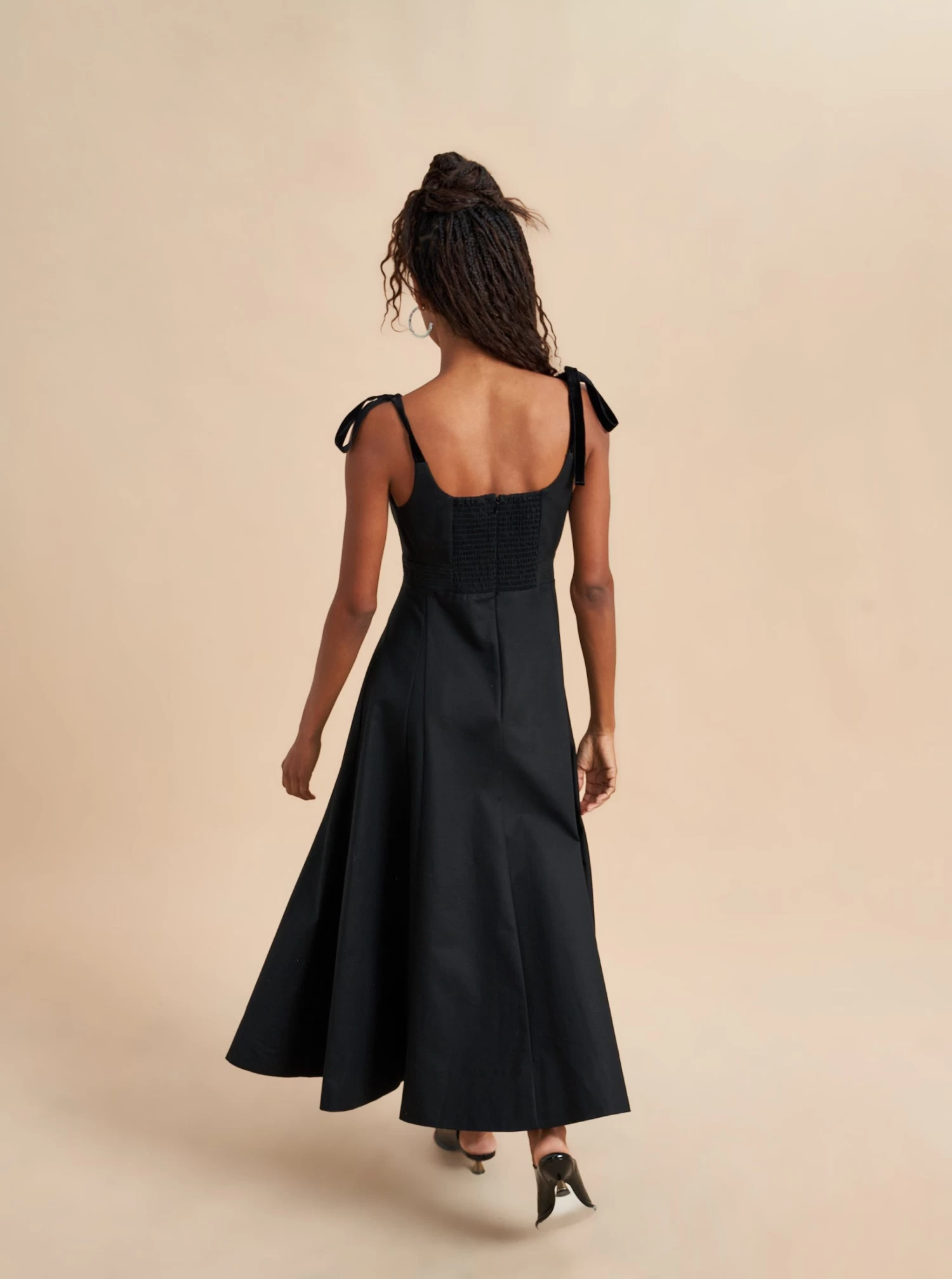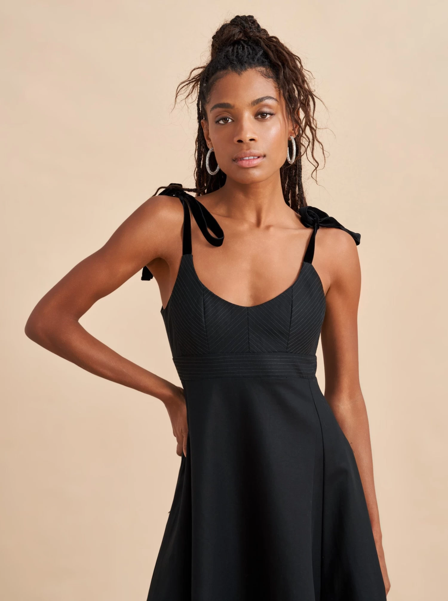 Named after La Bande member and Talent Executive, Rebecca Schwartz, this powerhouse of a dress does it all, from feminine velvet shoulder ties to tailored details like trapunto stitching on the bodice and a structured, flared skirt with godets. Serious but sweet, sexy yet restrained, you’re sure to break a few hearts along the way.