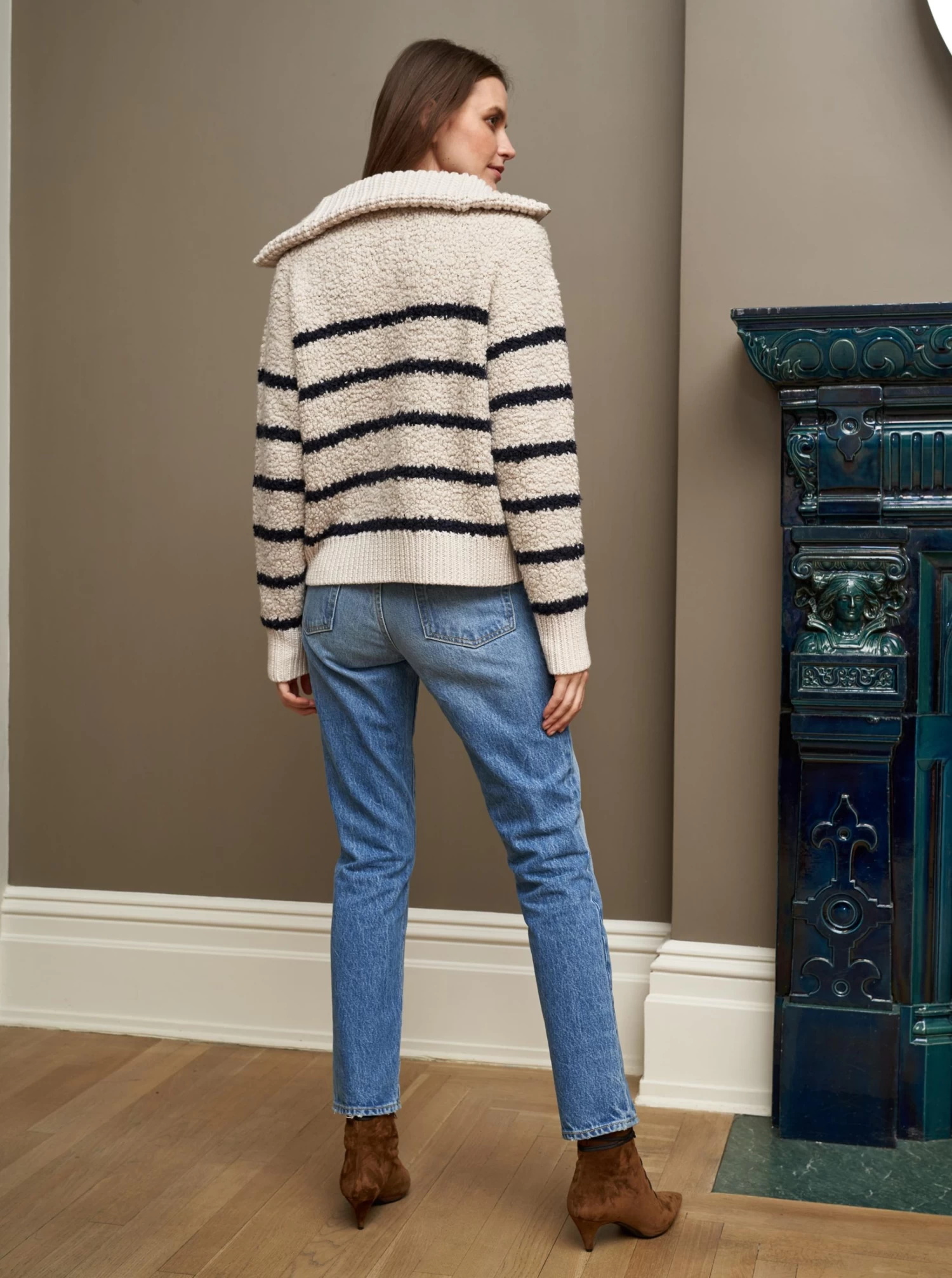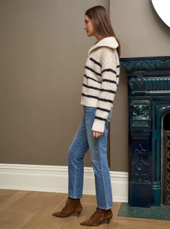 Our Sherpa Bastien Sweater is the newest closet staple where function meets fabulous in delicious striped bouclé wool fashioned in a borrowed-from-the-boys silhouette.