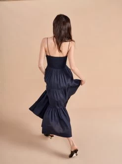 The Sleeveless Sofia Dress features a hand tacked bodice with center back smocking for ease and removable spaghetti straps to make it strapless. This show-stopper in neutral navy is just as at home with heels at a cocktail party or with sandals on the beach.A