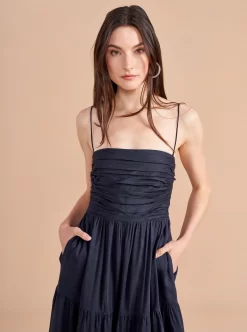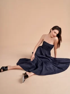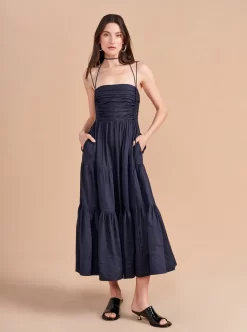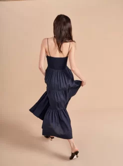 The Sleeveless Sofia Dress features a hand tacked bodice with center back smocking for ease and removable spaghetti straps to make it strapless. This show-stopper in neutral navy is just as at home with heels at a cocktail party or with sandals on the beach.A