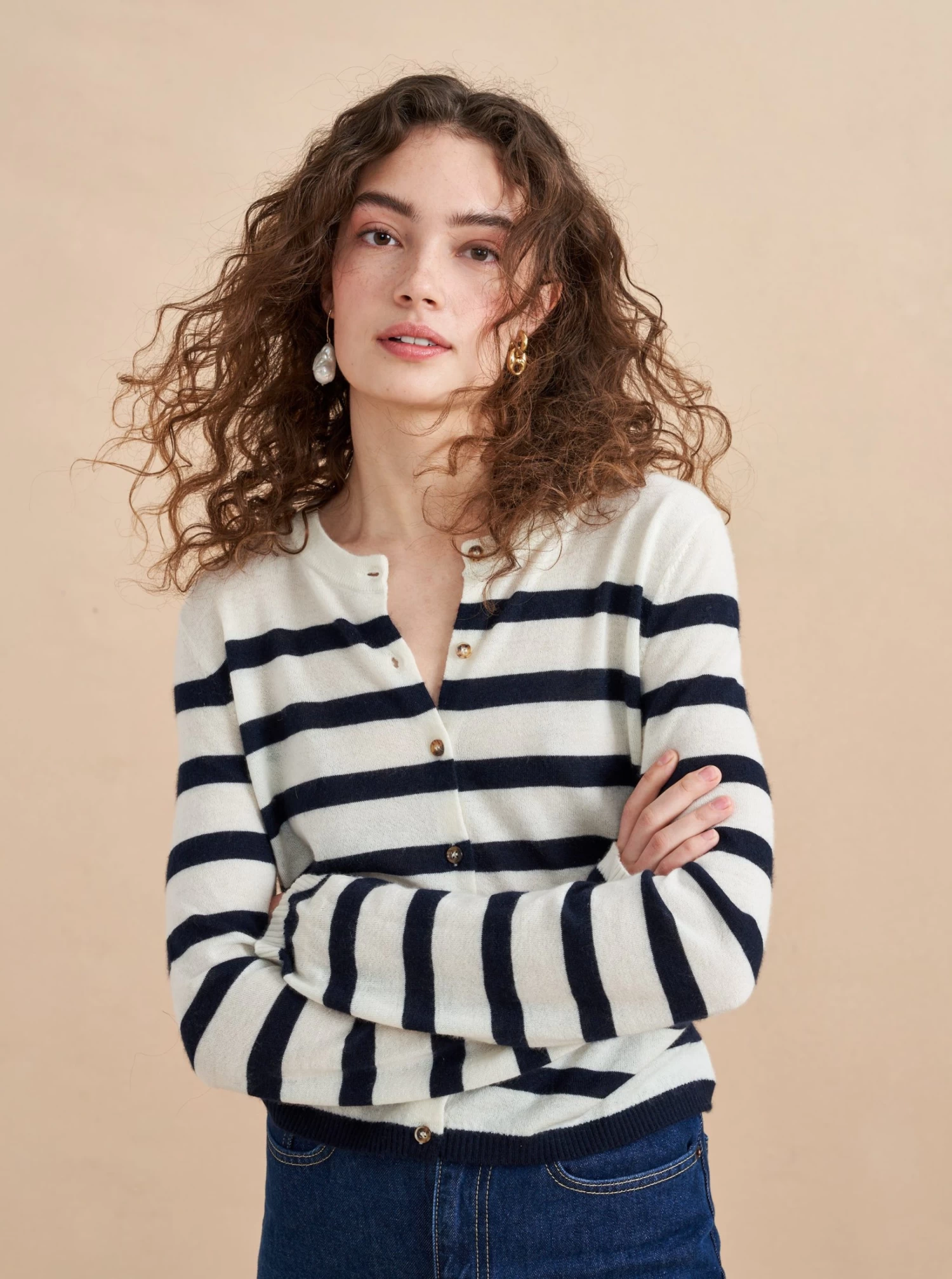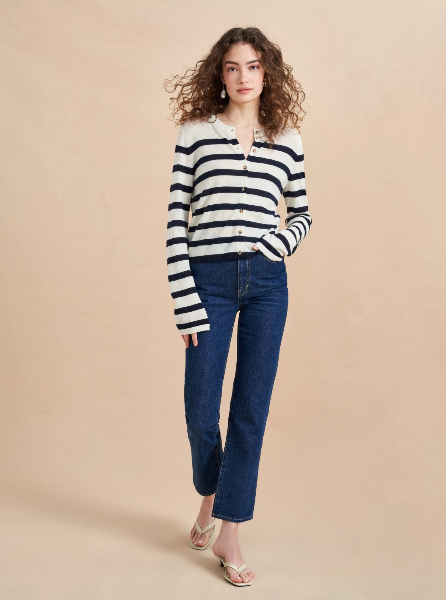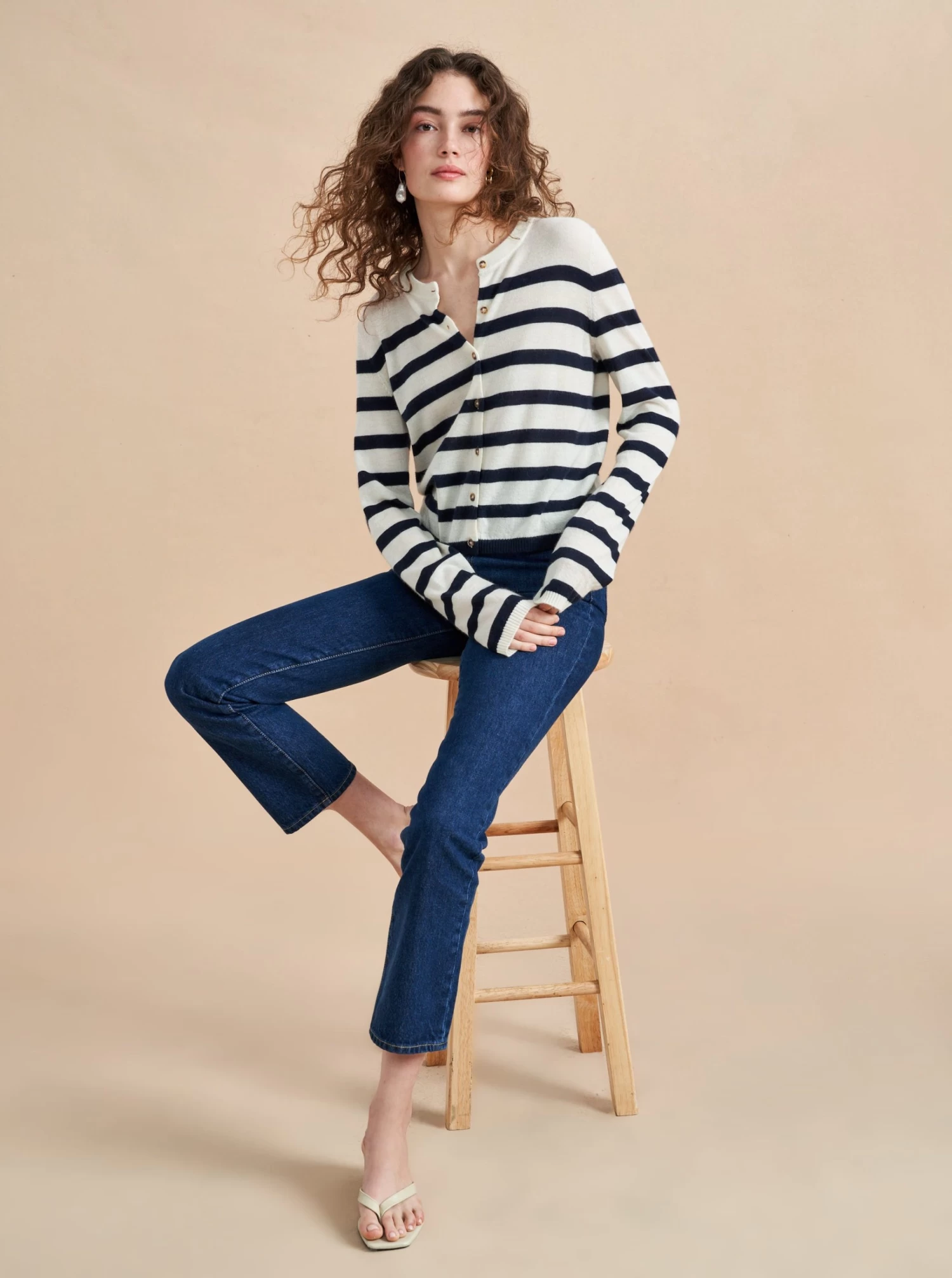 Lighter than air, our newest featherweight family is our lightest sweater we have made in 100% cashmere featuring a cropped body and classic breton stripes.