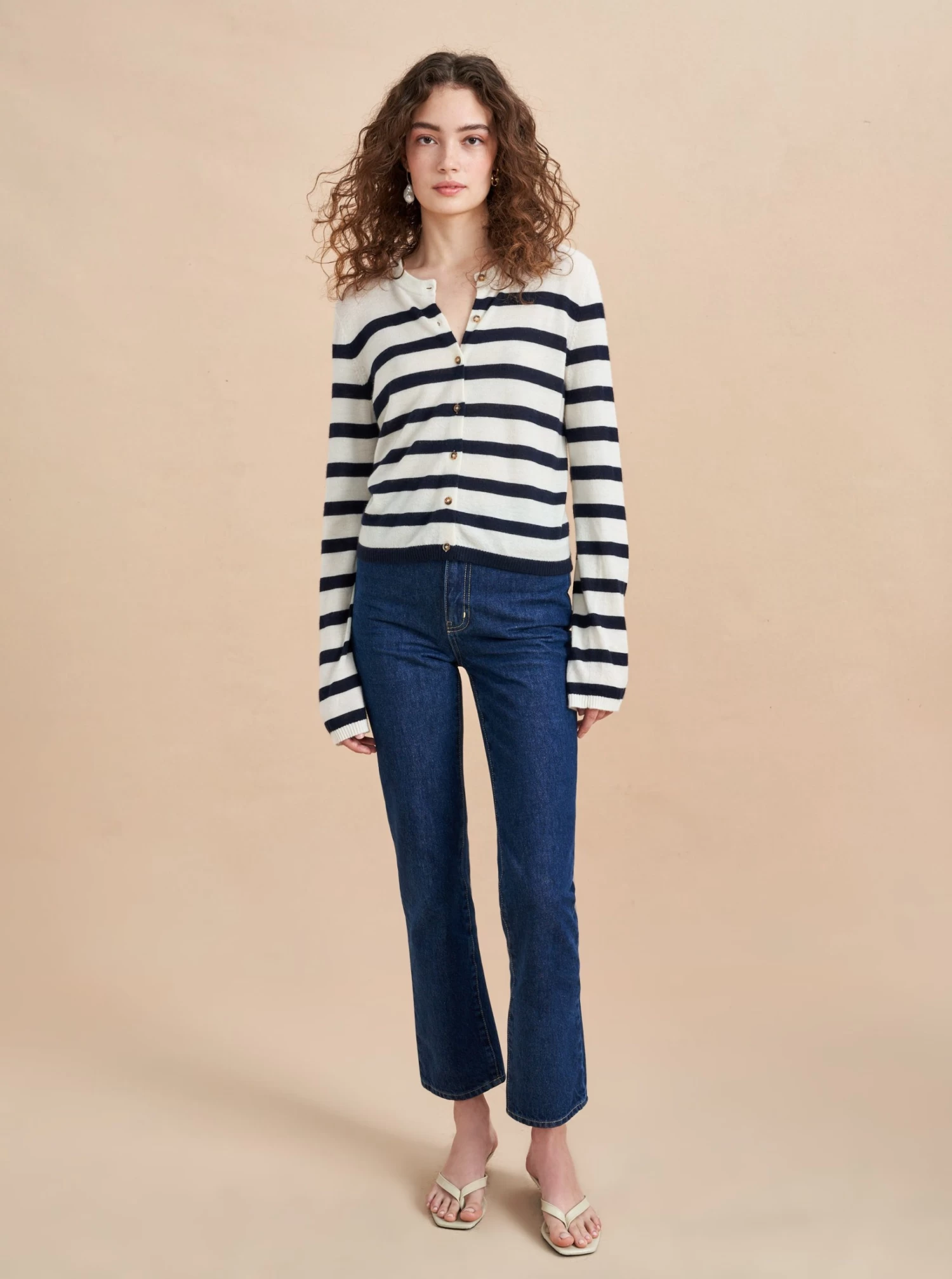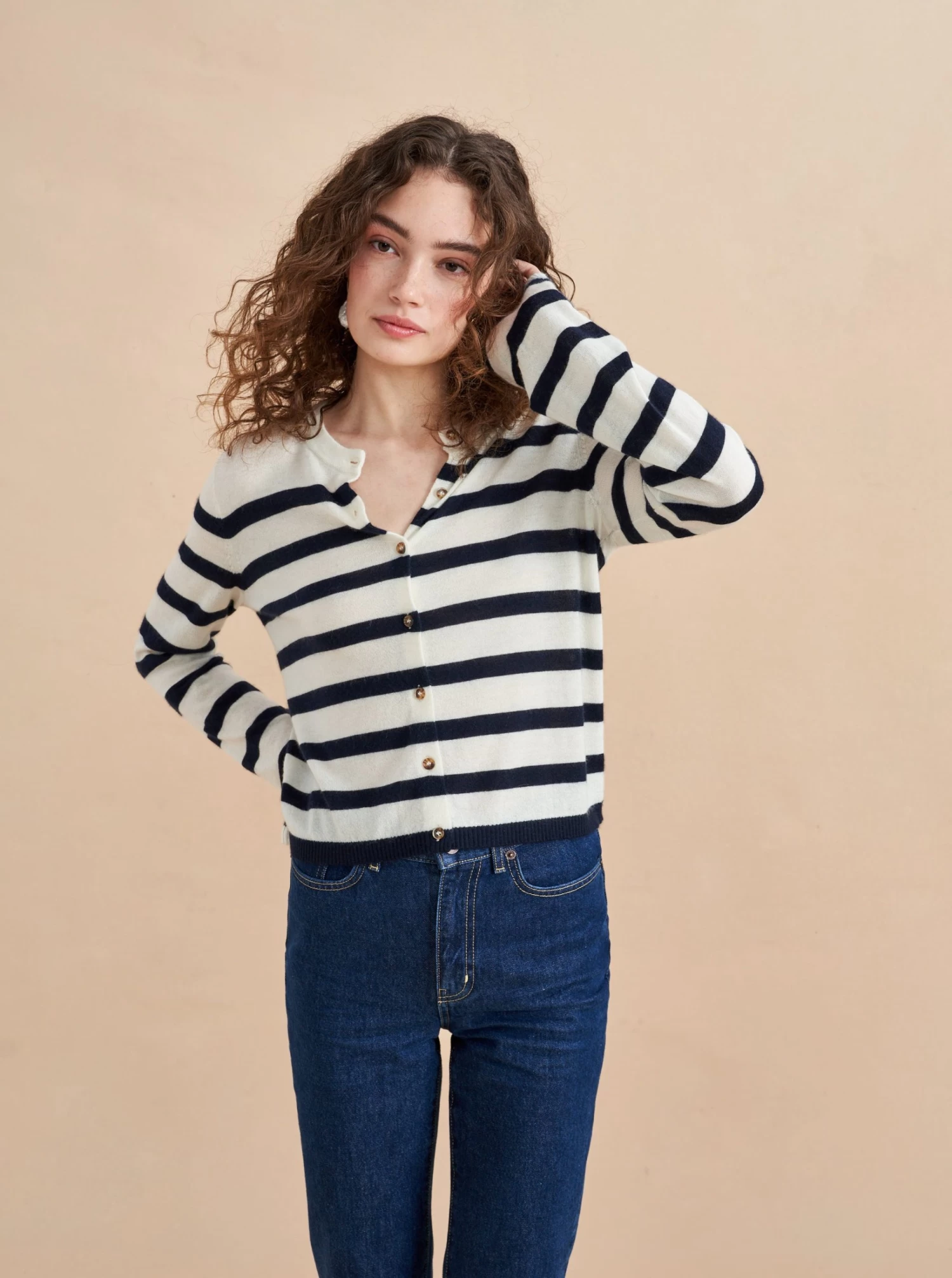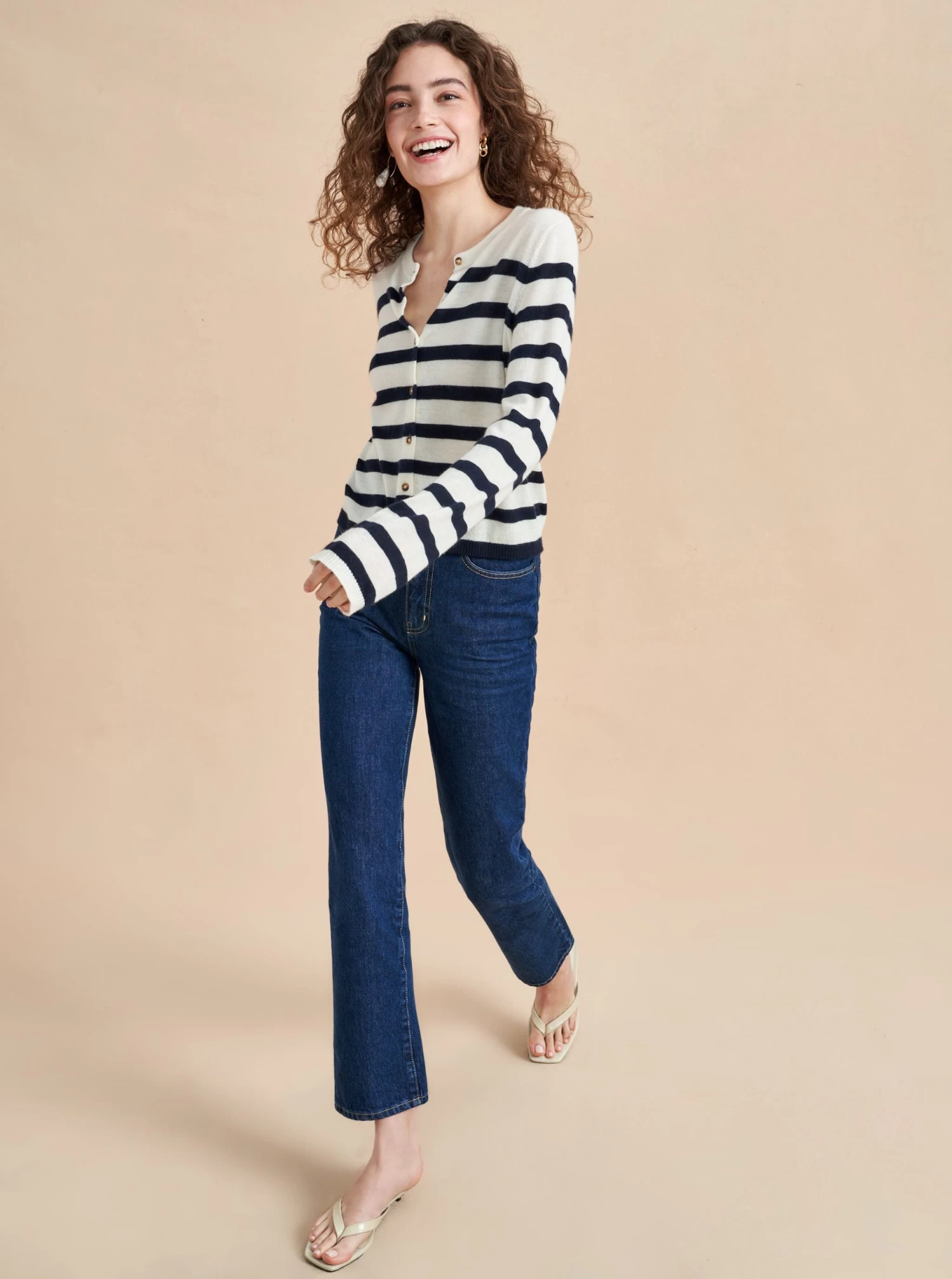 Lighter than air, our newest featherweight family is our lightest sweater we have made in 100% cashmere featuring a cropped body and classic breton stripes.