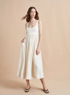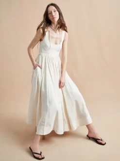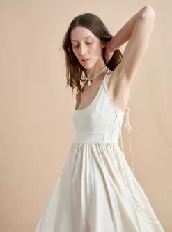 Our most seductive dress is also one of our most versatile. The Villanelle Dress in an ivory linen blend features trapunto stitching to create a corset-like bodice which is smocked in the back for comfort. Adjustable straps with back ties and a fully lined skirt make this dress your secret weapon for any of this season’s events.